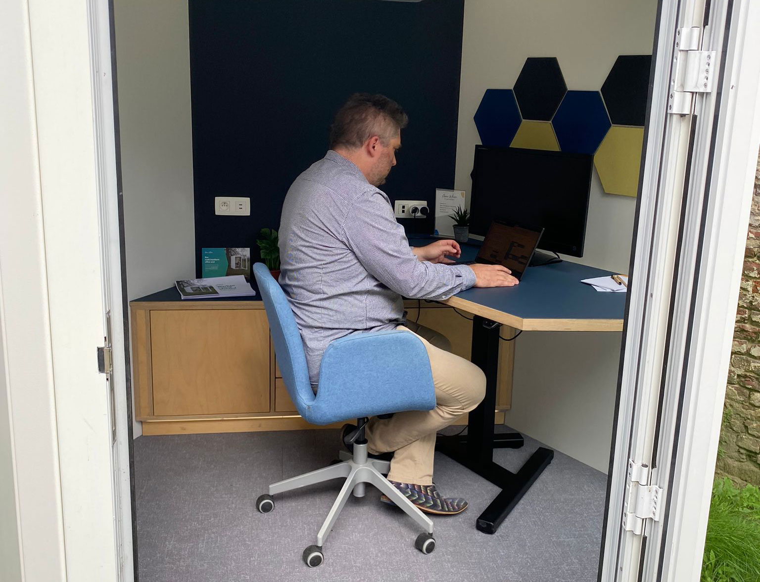 "Het is duidelijker voor m'n gezin wanneer ik aan het werk ben, ik zit in een professionele omgeving. Vrienden zijn ook altijd aangenaam verrast over de grootte en de opzet in de pod zelf. Veelal is het eerste idee dat het om een container in de tuin gaat, maar als ik dan trots de pod toon, reageren ze ook wel enthousiast."